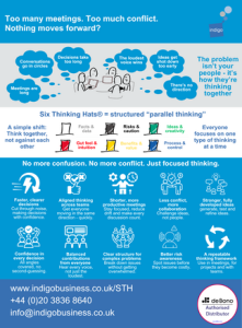 At Indigo, we’ve relied on Edward de Bono’s Six Thinking Hats® for years. It’s a simple, practical framework that transforms how teams think, meet and make decisions. Turning chaos into clarity.